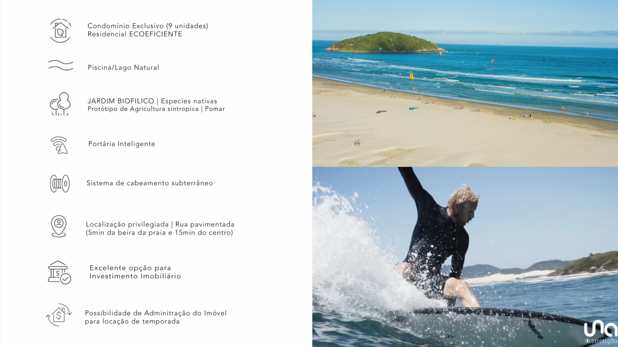 Um condomínio fechado com casas próximas da Lagoa Doce, no bairro Arroio, em Imbituba SC. A Morada Residencial Ecoeficiente é um condomínio exclusivo com apenas 9 casas, em rua pavimentada cercada pela natureza, com fácil acesso à BR-101, às dunas, à Lagoa de Ibiraquera e à Barra de Ibiraquera. Criado com foco em sustentabilidade, o projeto une arquitetura bioclimática e o conceito de passive house, sendo uma excelente opção para quem busca casa em condomínio fechado perto da Lagoa Doce, tanto para moradia quanto para investimento em aluguel de temporada. O condomínio oferece piscina natural, jardim biofílico, pomar com espécies nativas e portaria inteligente.
